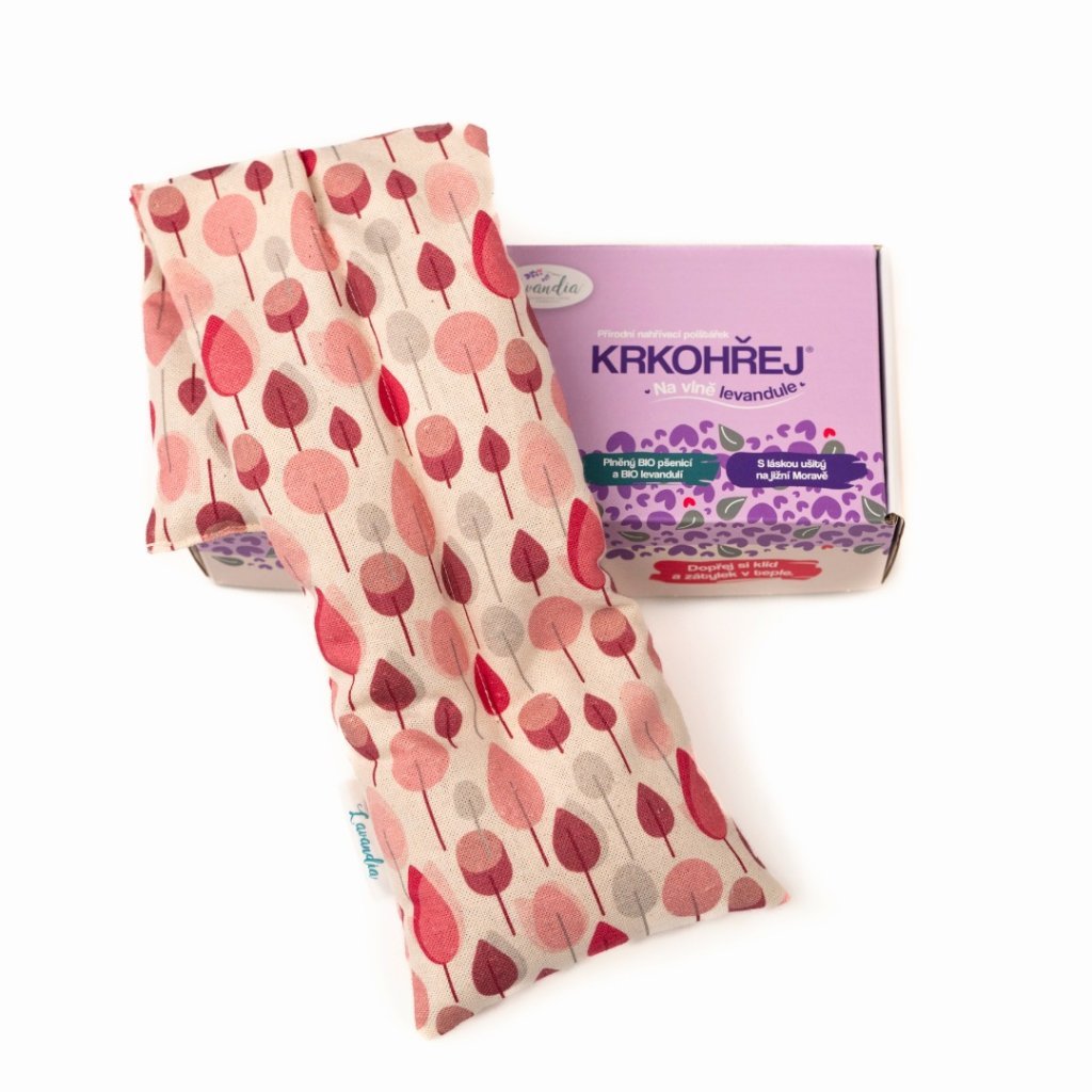 Hřejivý krční polštář o rozměrech 46 x 14 cm naplněný pšenicí a květem BIO levandule. Zabaleno v celofánovém obalu, vloženo do dárkové krabičky.