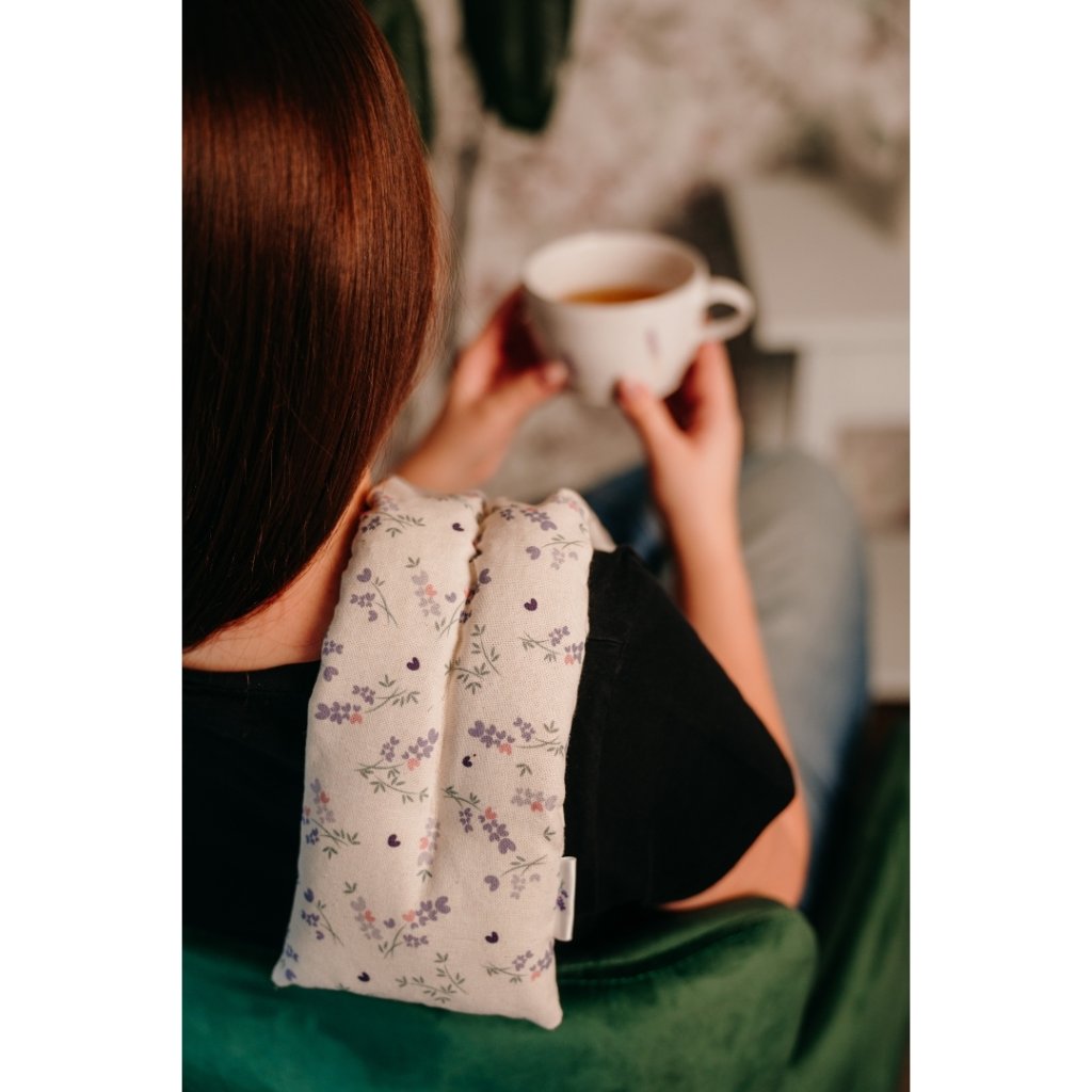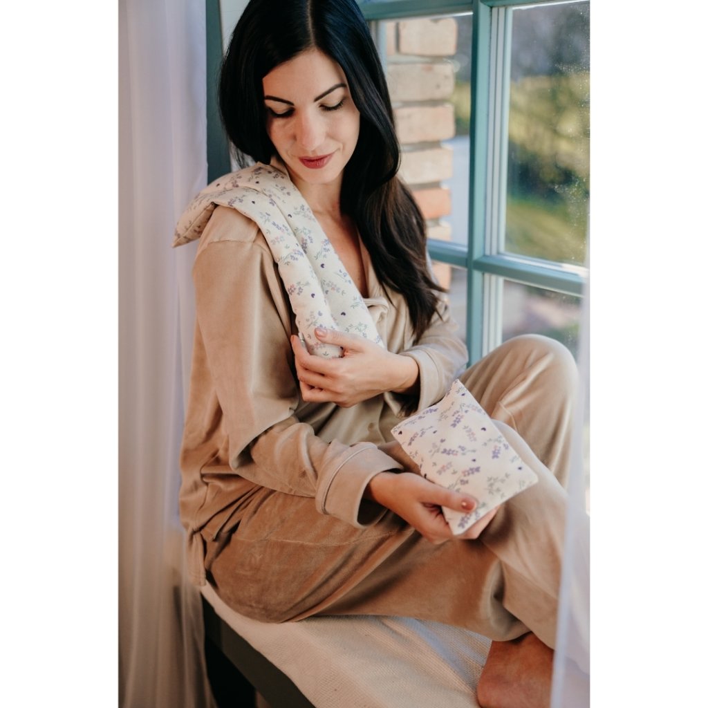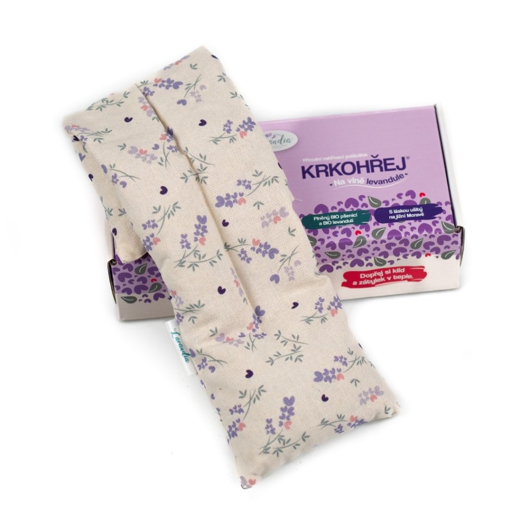 Hřejivý krční polštář o rozměrech 46 x 14 cm naplněný pšenicí a květem BIO levandule. Zabaleno v celofánovém obalu, vloženo do dárkové krabičky.