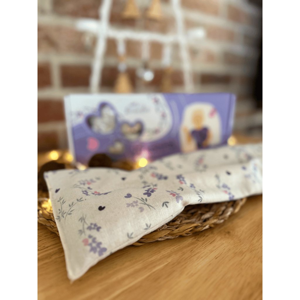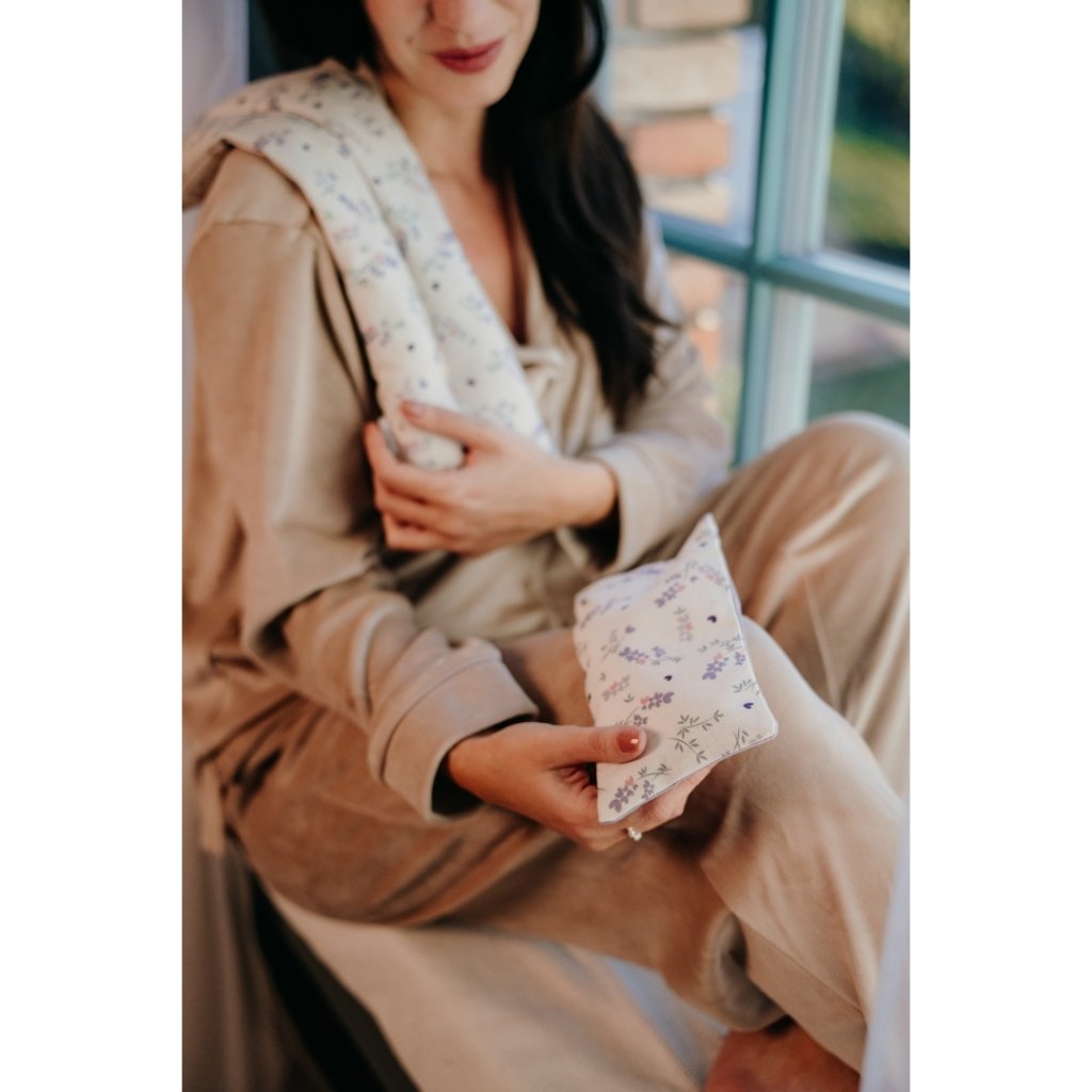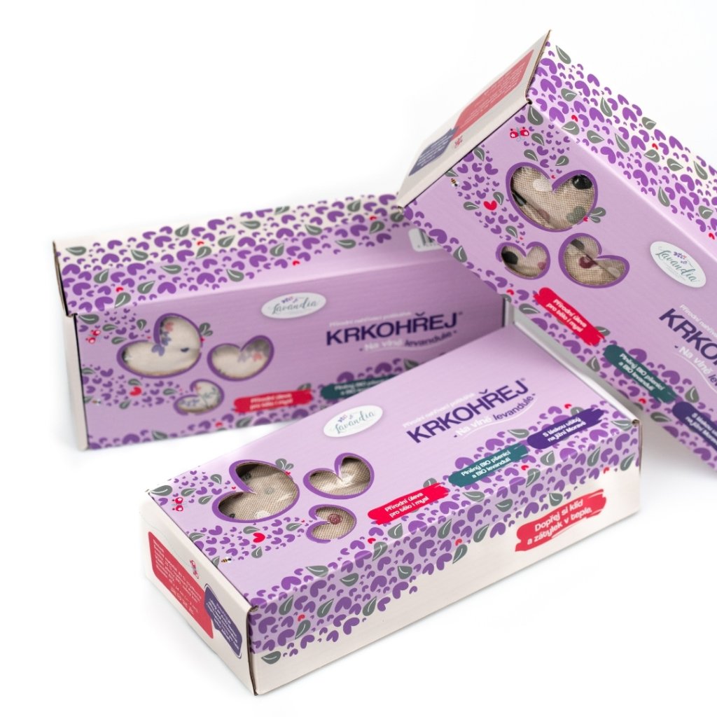 Hřejivý krční polštář o rozměrech 46 x 14 cm naplněný pšenicí a květem BIO levandule. Zabaleno v celofánovém obalu, vloženo do dárkové krabičky.
