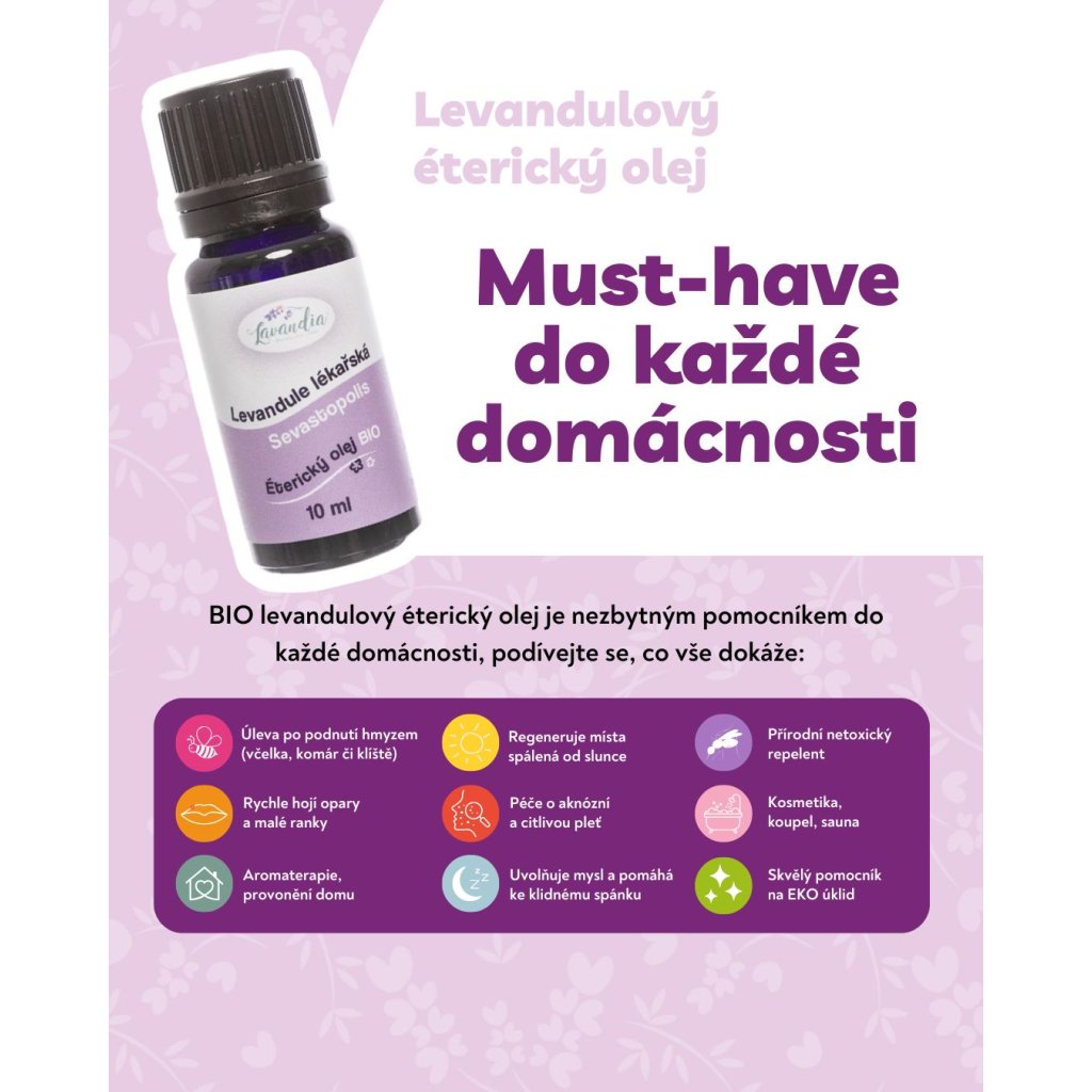 Éterický olej levandule lékařská BIO Všestranný pomocník do každé lékárničky