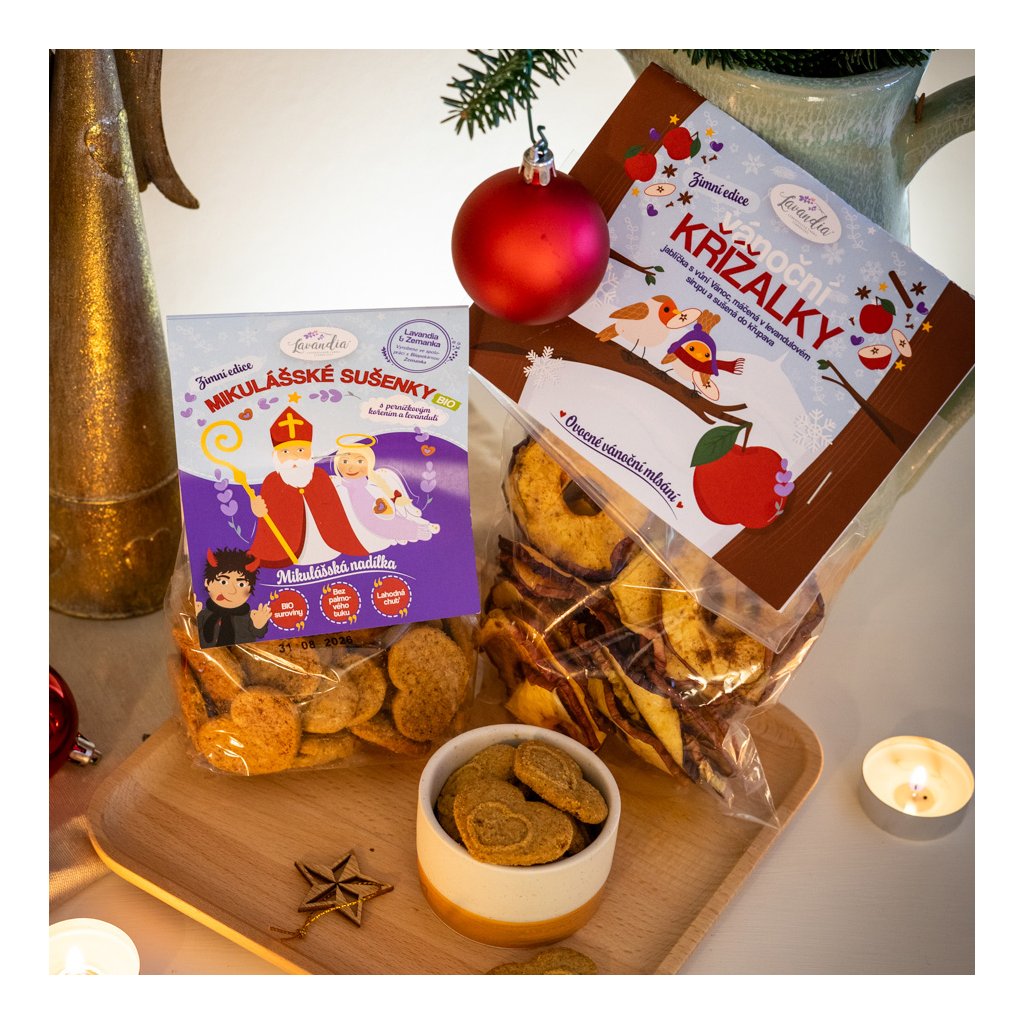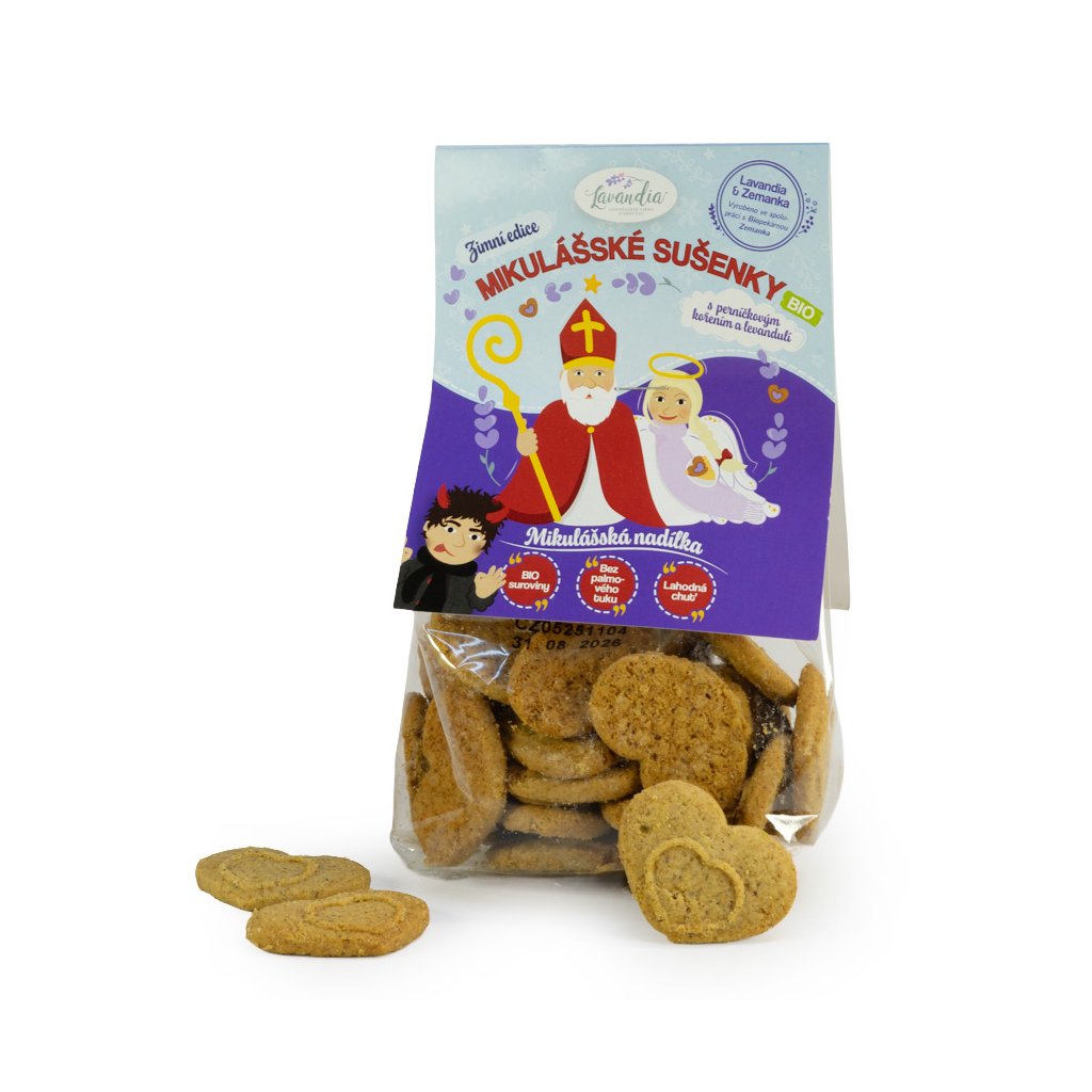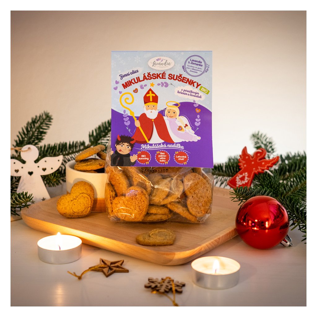 Naše Mikulášské sušenky s perníčkovým kořením a levandulí BIO jsou jako malý dárek z pece – voňavé, poctivé a upečené s láskou.
