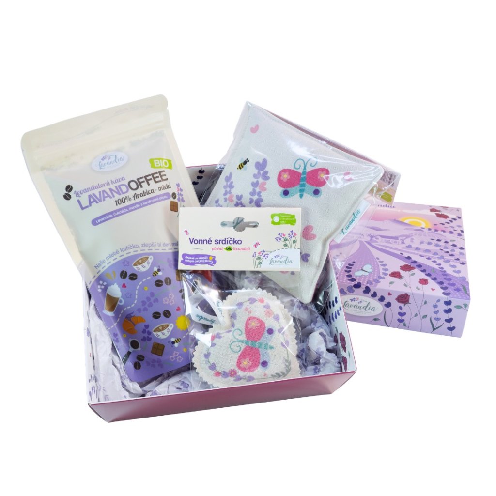 V setu najdete naši výběrovou levandulovou kávu ze spolupráce z pražírnou Coffeespot, voňavý podšálek plněný levandulí lékařskou a ladící vonné srdíčko. Ručně šitý podšálek i vonné srdíčko zdobí pestré ilustrace z naší nové Lavandia kolekce. Celou sadu Vám dárkově zabalí naše šikovná Hanka do dárkové krabičky a hedvábného fialového papíru.