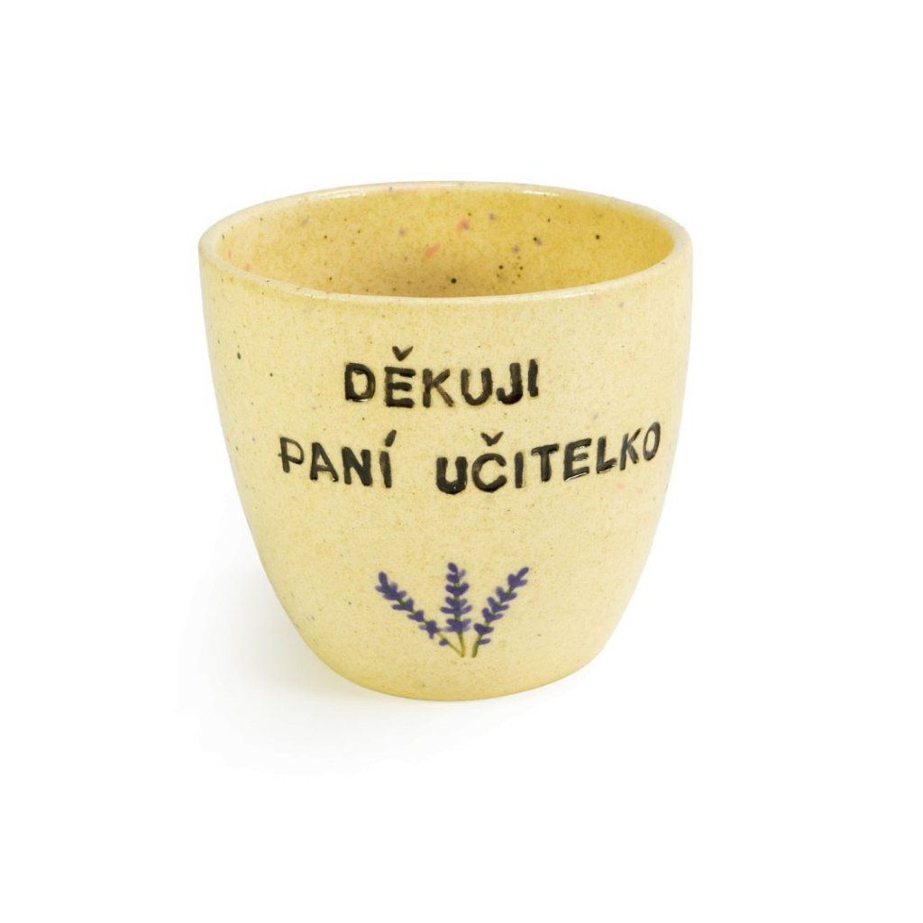 Ručně vyráběný keramický hrnek s nápisem „Děkuji, paní učitelko“ je krásným dárkem na konec školního roku. Každý kus je originál – drobné odchylky v dekoru i tvaru podtrhují jeho autentičnost a kouzlo ruční práce.