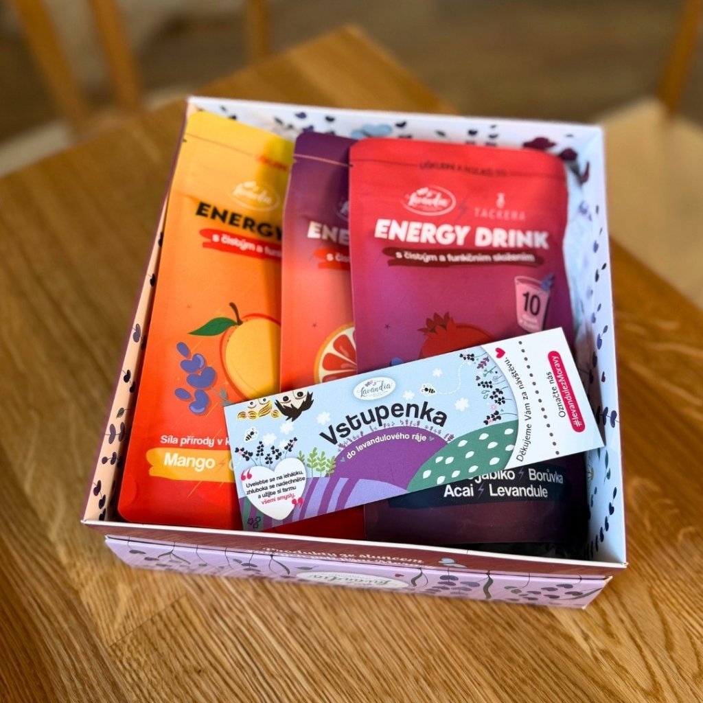 Set obsahuje Grapefruit & levandule, Granátové jablko & borůvka & levandule a Mango & citron & levandule – vše dárkově zabalené a připravené dodat energii kdykoliv během dne. 🥭🍊🫐