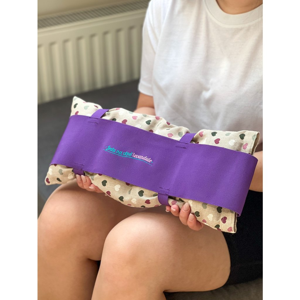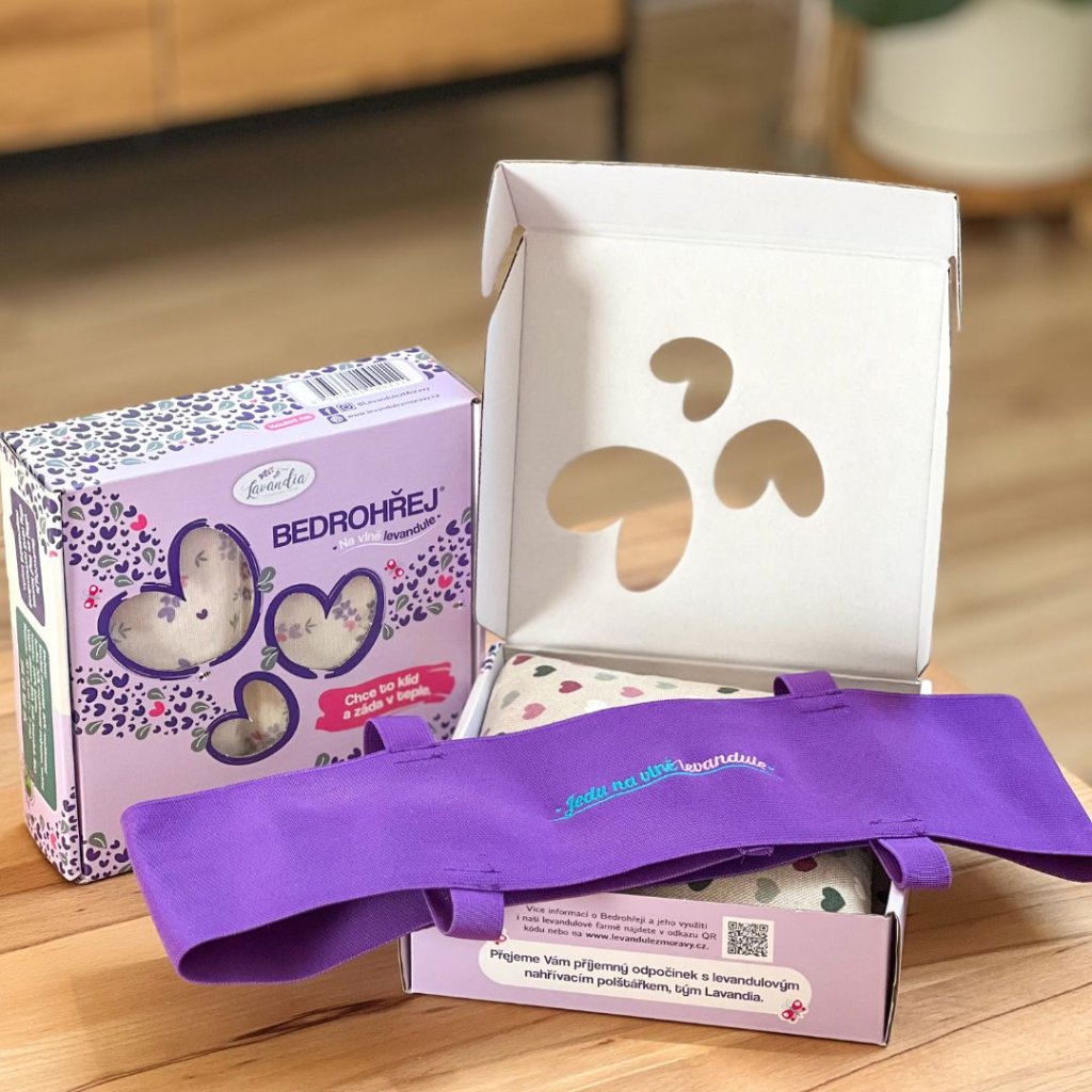 Objednávka obsahuje: Hřejivý bederní polštář o rozměrech 40 x 20 cm se snímatelným a pratelným potahem, naplněný pšenicí a květem BIO levandule v dárkové krabičce + přidělávací pás na bedra ve vybrané velikosti.