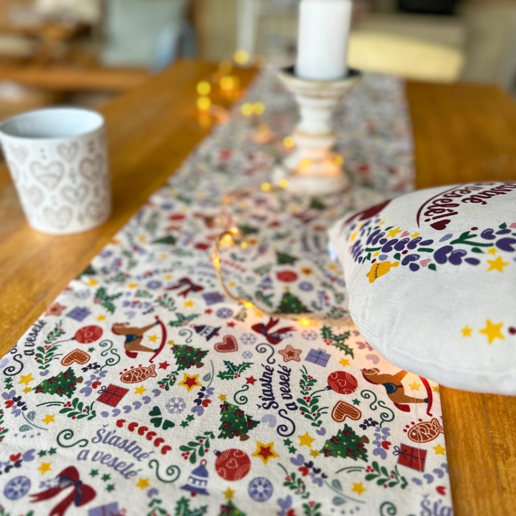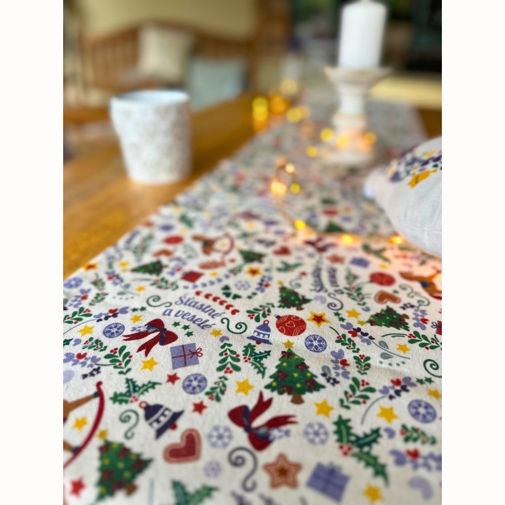 Vánoční běhoun na stůl - Šťastné a veselé 133x30 cm