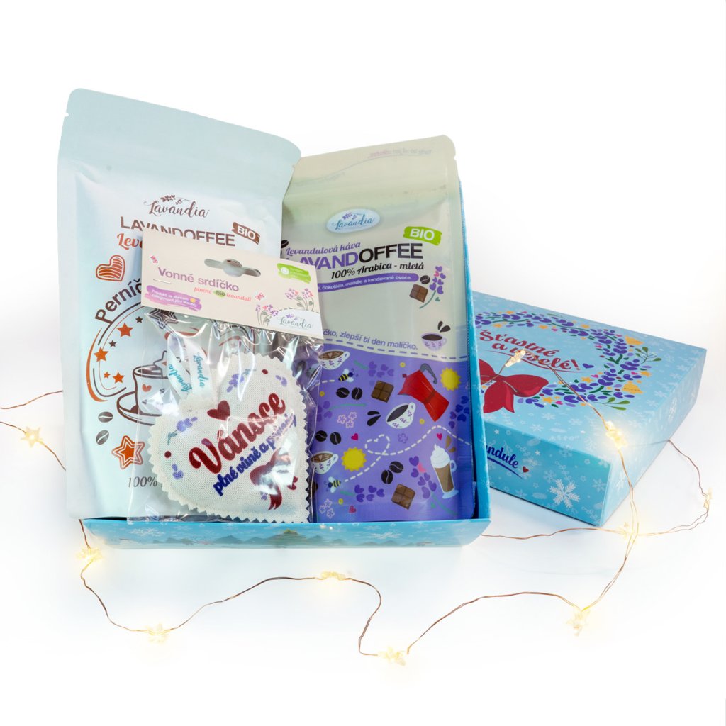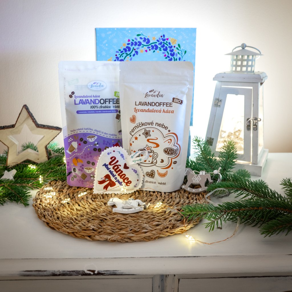 V setu najdete hned dvě naše výběrové kávy - levandulovou kávu a Perníčkové nebe, ze spolupráce z pražírnou Coffeespot. Součástí je také vonnné srdíčko s naší bio levandulkou. Celou sadu Vám zabalí naše šikovné děvčata do dárkové krabičky a hedvábného fialového papíru.