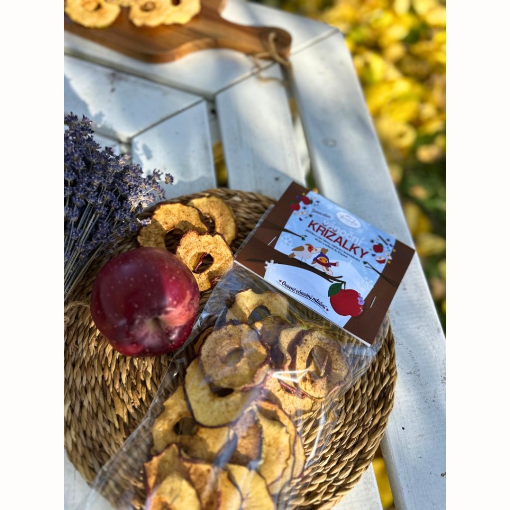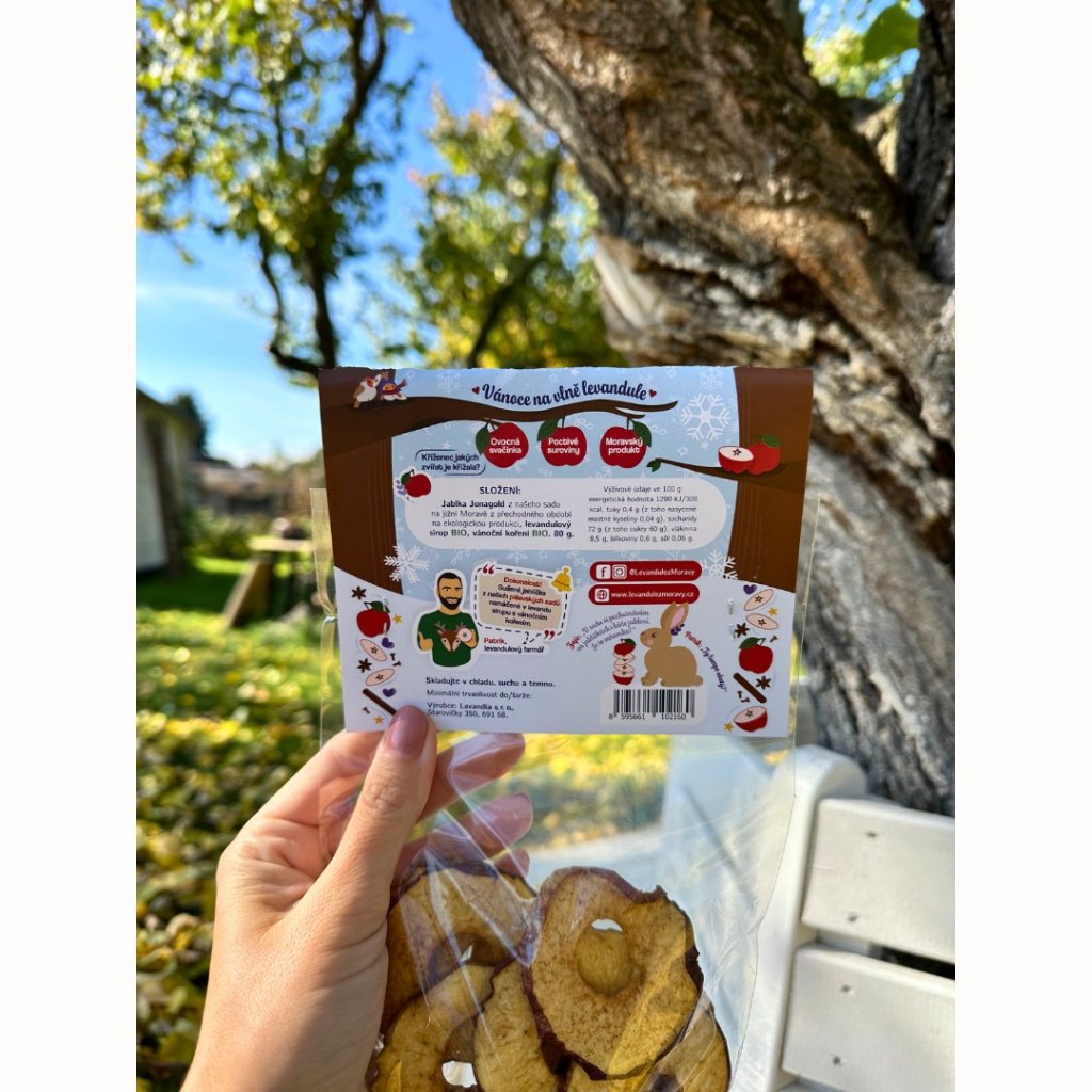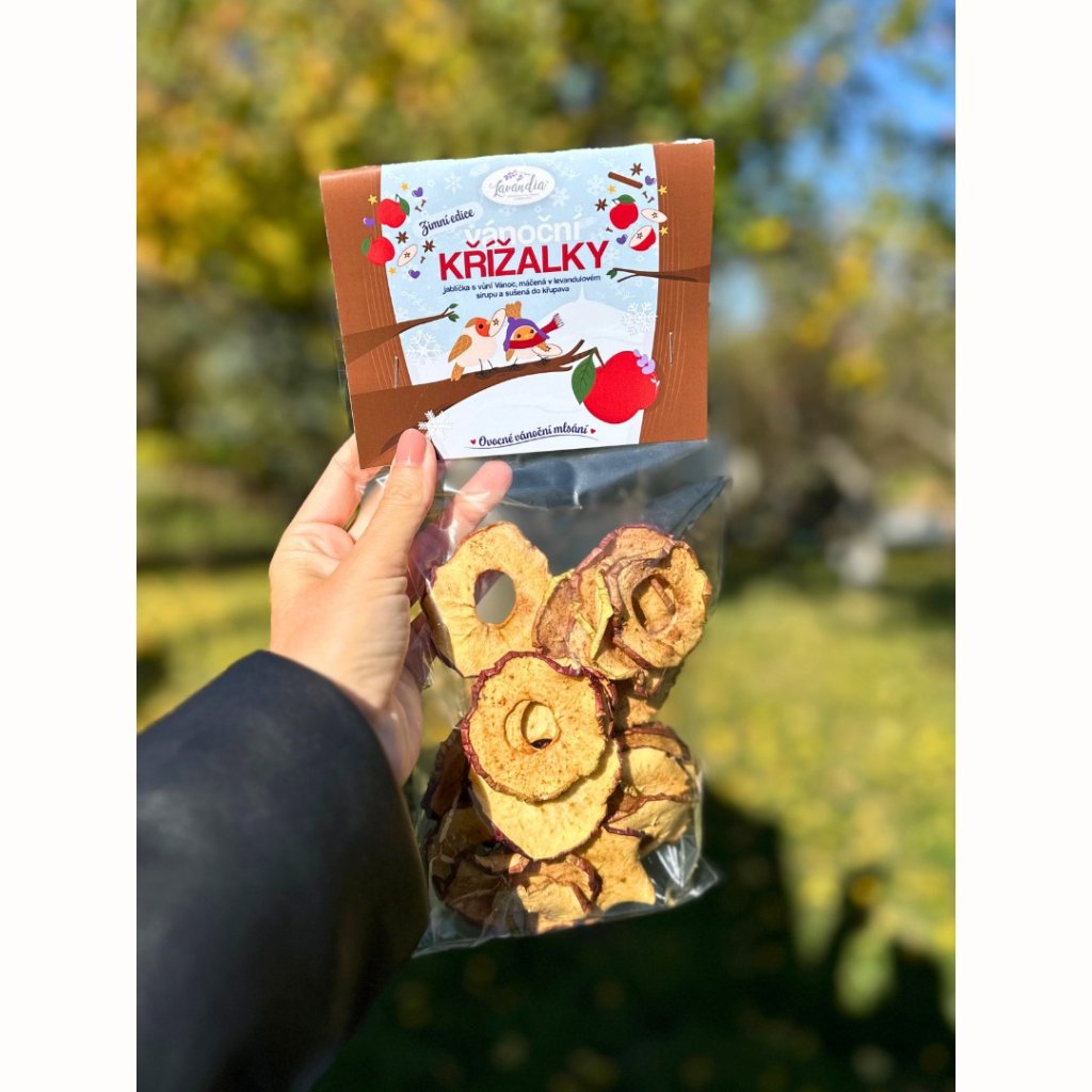 Naše Vánoční křížalky jsou poctivě sušená červená jablíčka Jonagold z našeho ovocného sadu na jižní Moravě, máčená v levandulovém sirupu a usušená do křupava. Žádný cukr, žádné konzervanty – jen čistá chuť domova, kapka levandulového kouzla a chuť, která připomíná zimní odpoledne na Moravě. 💜